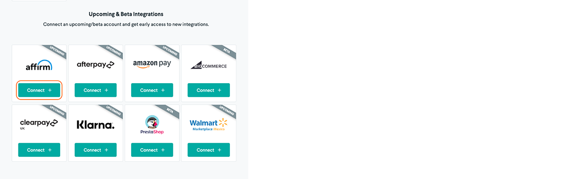 - Navigate to the Upcoming & Beta Integrations section and select Connect on the Affirm card.