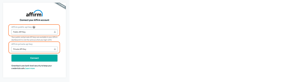 To connect the Affirm integration, you'll need to authorize Dext Commerce using your Affirm API Credentials.