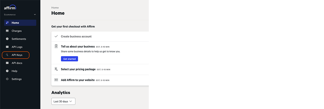 In a separate window, log into your Affirm account and navigate to your Affirm Merchant Portal.