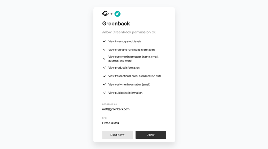 Most integrations that provide an app store for customers to explore third party apps will use oAuth authentication. With this method you are redirected from Greenback to an approval process within the integration's own website. You will have to first sign-in to your account and approve the request to connect your account to Greenback. Squarespace as an example: