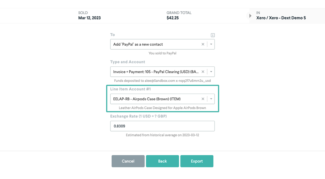 In our example, the product sold in the sales transaction was 'Leather Airpods Case Designed for Apple AirPods Brown'. In our accounting file, that product is set up as 'Airpods Case (Brown)'. So when we export our transaction, we select that item.
