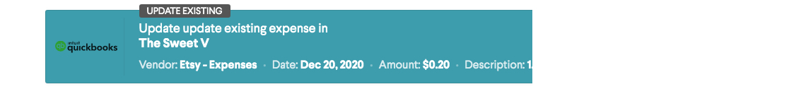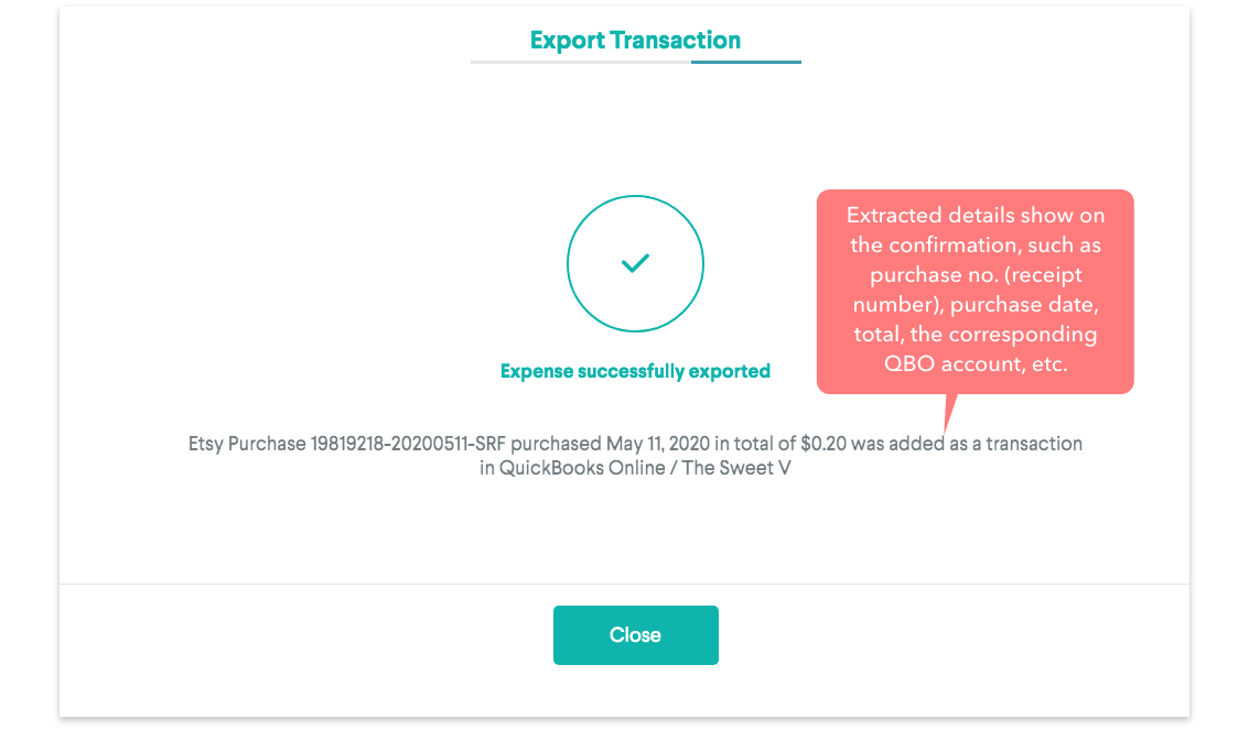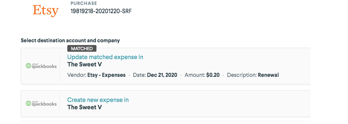 Commerce searches for matches and duplicates in all of your QuickBooks Online accounts. If a match is found you have the option to update the matched expense or create a new one.