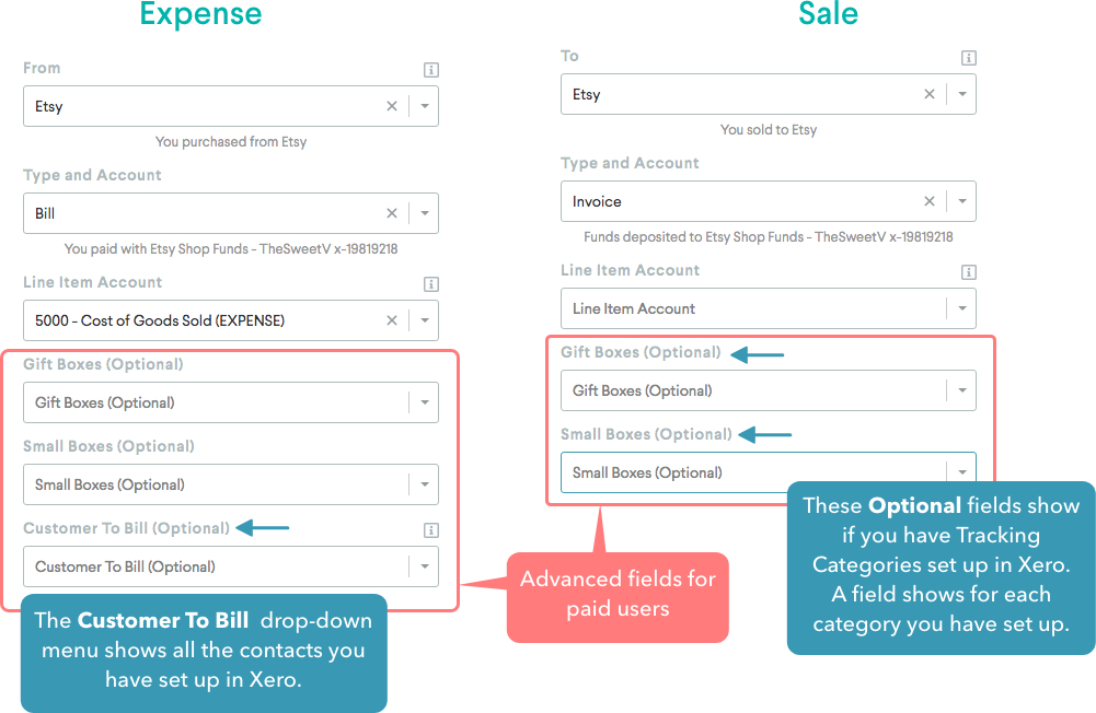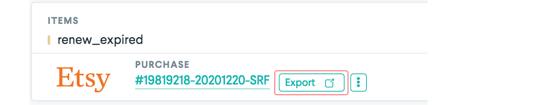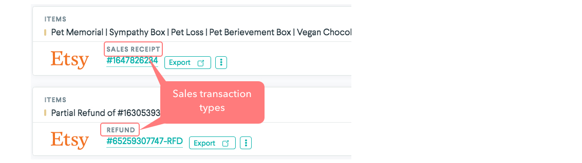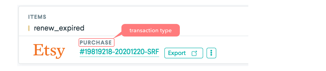 Hints extracted directly from the receipt or ancillary transaction will display below the field to help you accurately decide the export destination. Ex: “You paid with Visa x-4242”, “You paid with Etsy Shop Funds-Acme Soap x-1200400