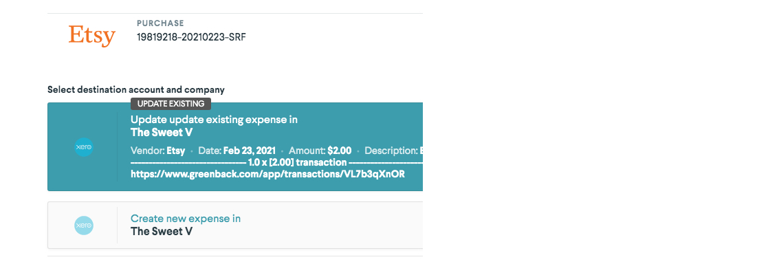 Greenback searches for matches and duplicates in all of your Xero accounts. If a match is found you have the option to update the matched expense or create a new one.