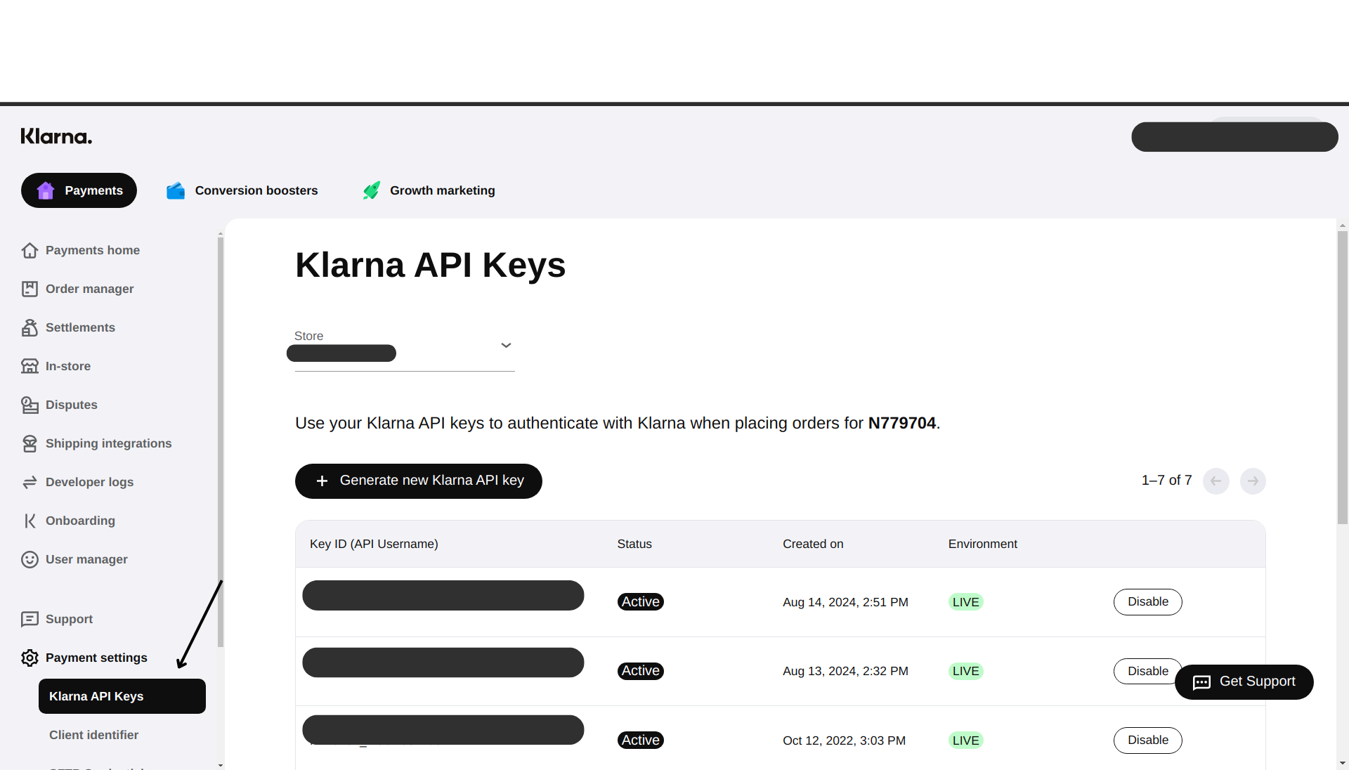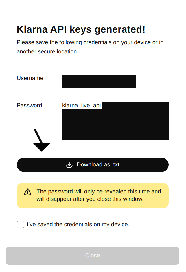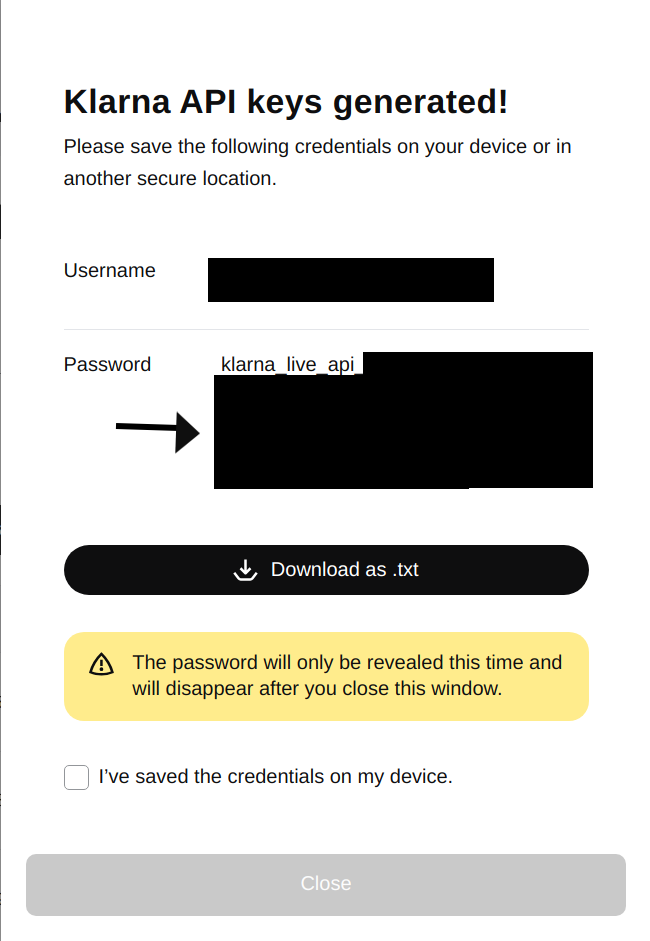 - Select Generate new Klarna API Key