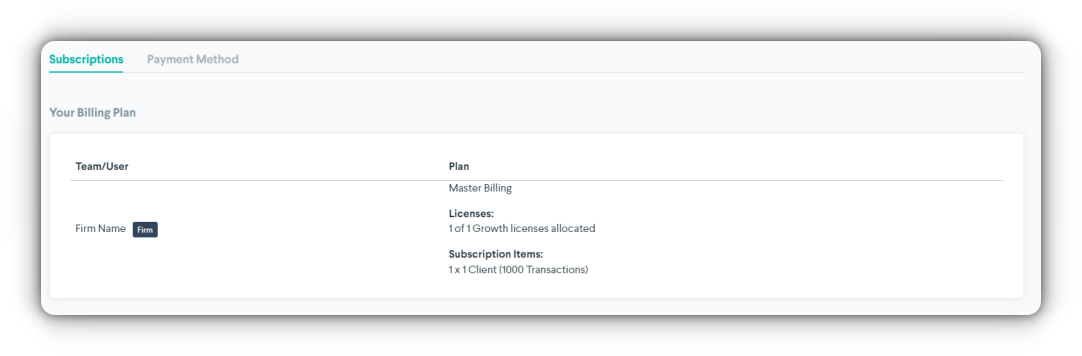 This area shows the particulars about your purchased license(s). Find the name of your Firm, billing plan, amount and type of license, and amount of transactions allowed.