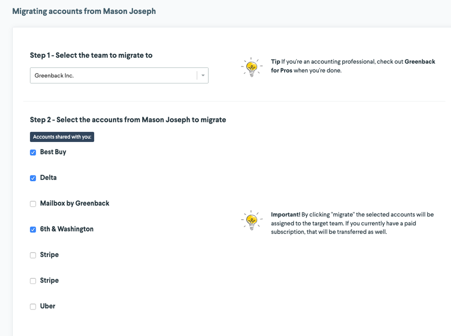 Users with an active subscription to Greenback can only migrate accounts to a Team with an active subscription.