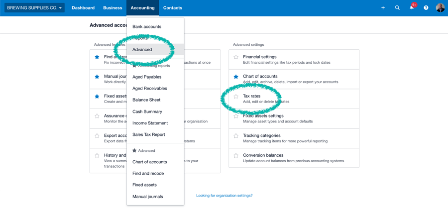 - In the Accounting menu, select Advanced, then click Tax rates.