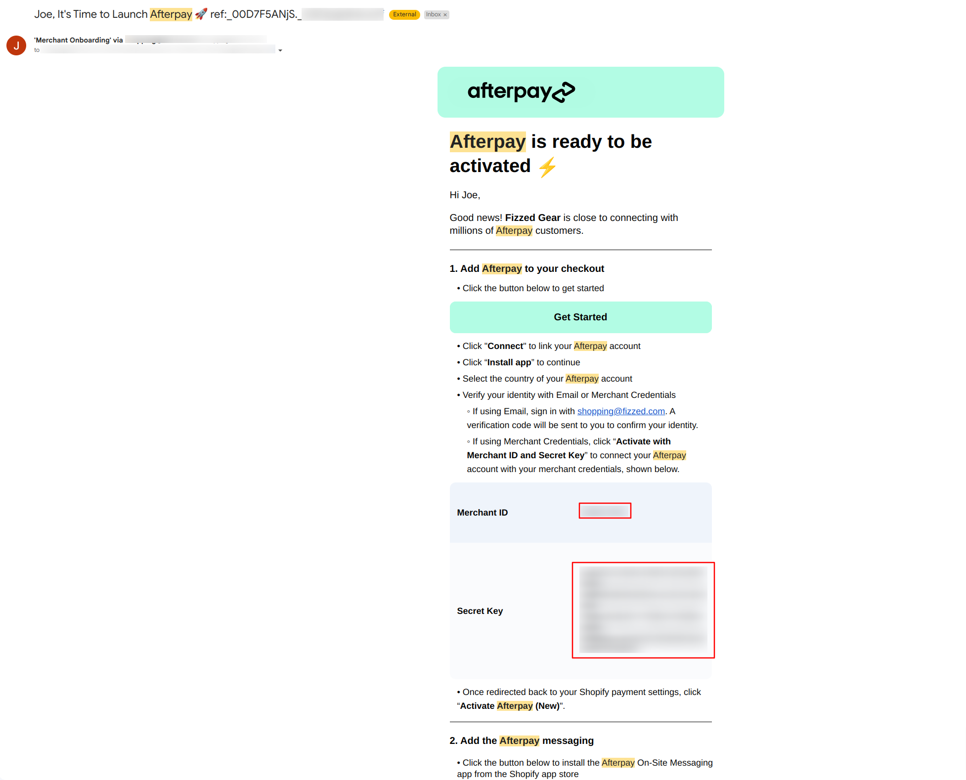 - Obtain your Merchant ID and Secret Key from Afterpay. This will be in an email sent from Afterpay during the on-boarding.