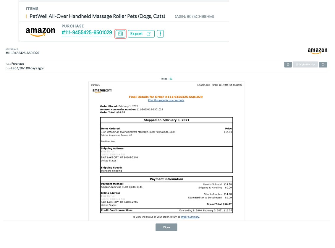 An original receipt is a PDF file from an upstream integration (e.g. Amazon) that is usually provided in your Order History. The original receipts provided by this authoritative source are shown in your Greenback transaction feed with a special callout. If an original receipt is available, a receipt icon is visible on that specific transaction.