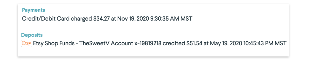 The Payments section includes the payment type (card type, Etsy funds, etc.), the last 4 digits of the card (if used), the amount charged, and the date of payment. The Deposits section includes the account, amount, and date of payment.