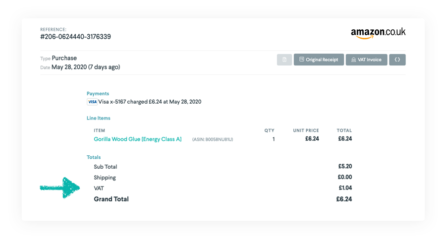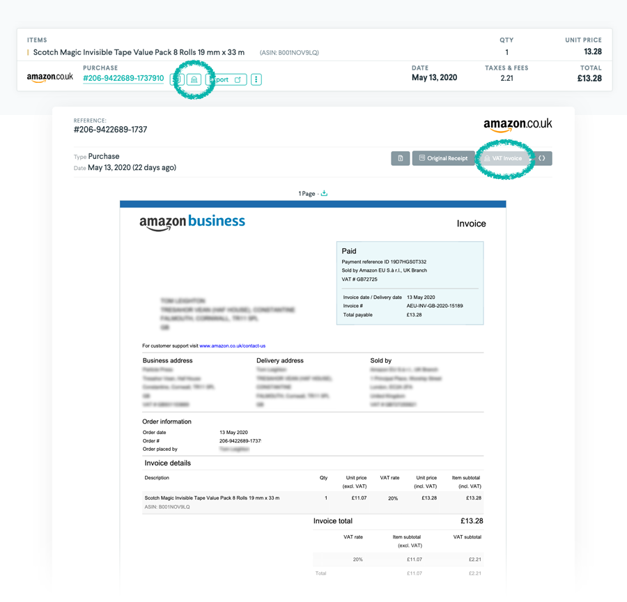 An original VAT invoice is a PDF file from an upstream integration (e.g. Amazon) that is usually provided in your Invoices tab. The VAT/GST/HST/PST invoices provided by this authoritative source are shown in your Greenback transaction feed with a special callout. If a VAT invoice (created by the seller) is available, an invoice icon is visible on that specific transaction.