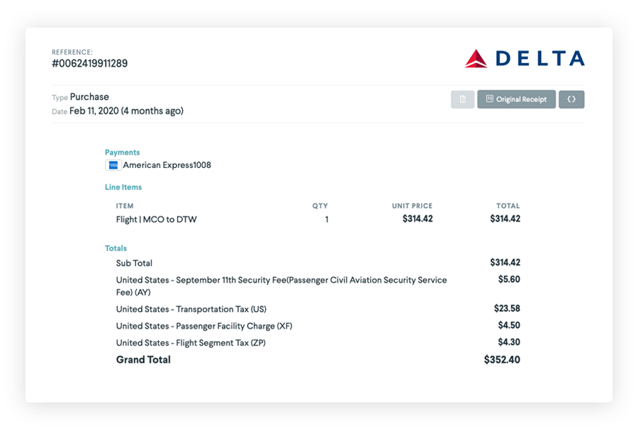 Some integrations may support additional itemized taxes and fees such as transportation related taxes and fees as shown in this example from Delta Airlines.